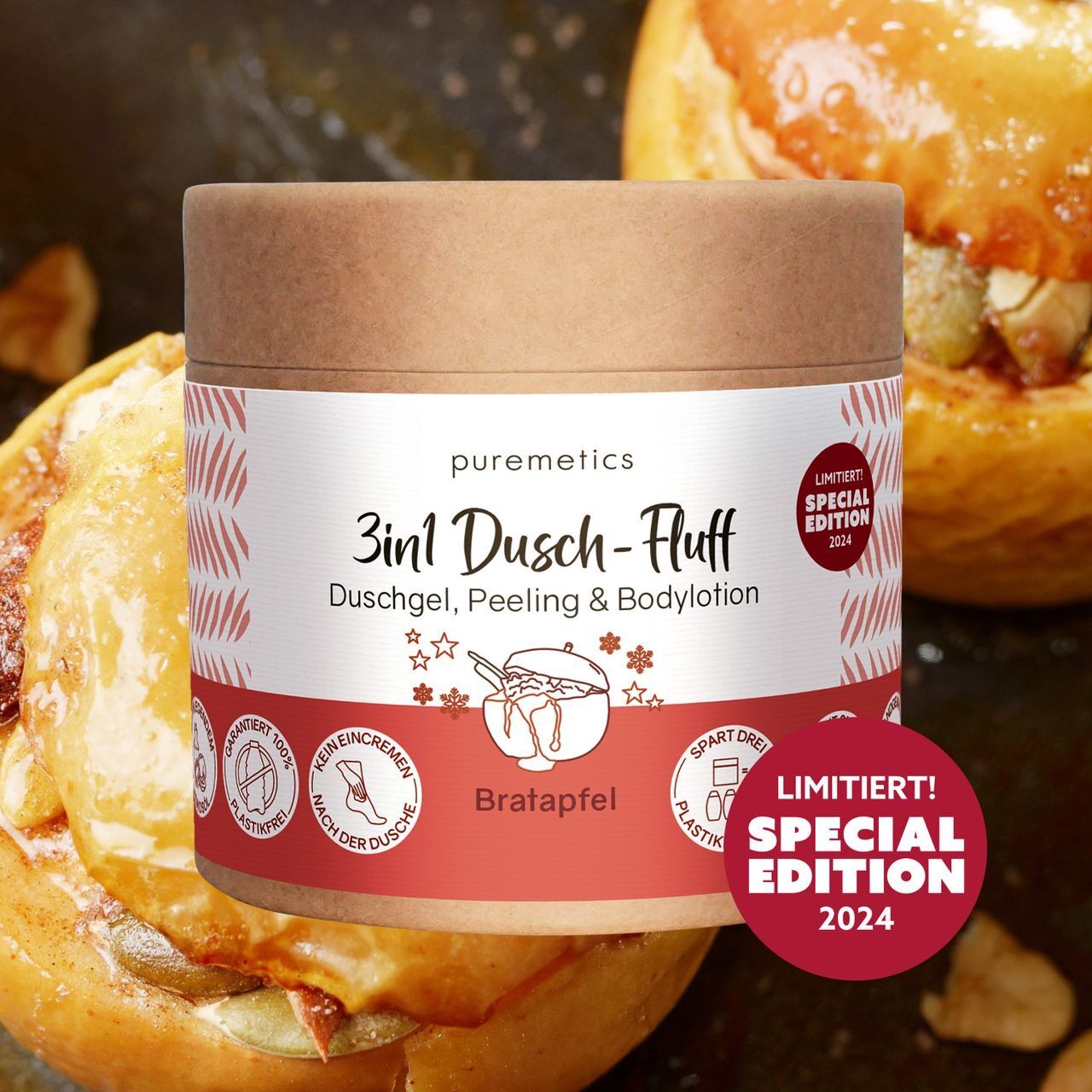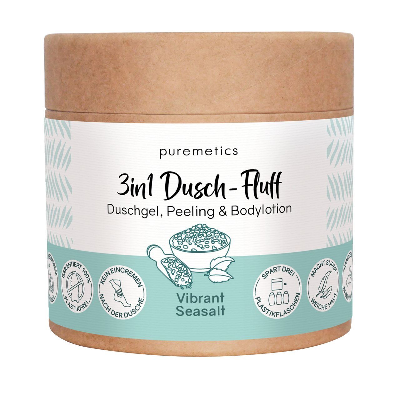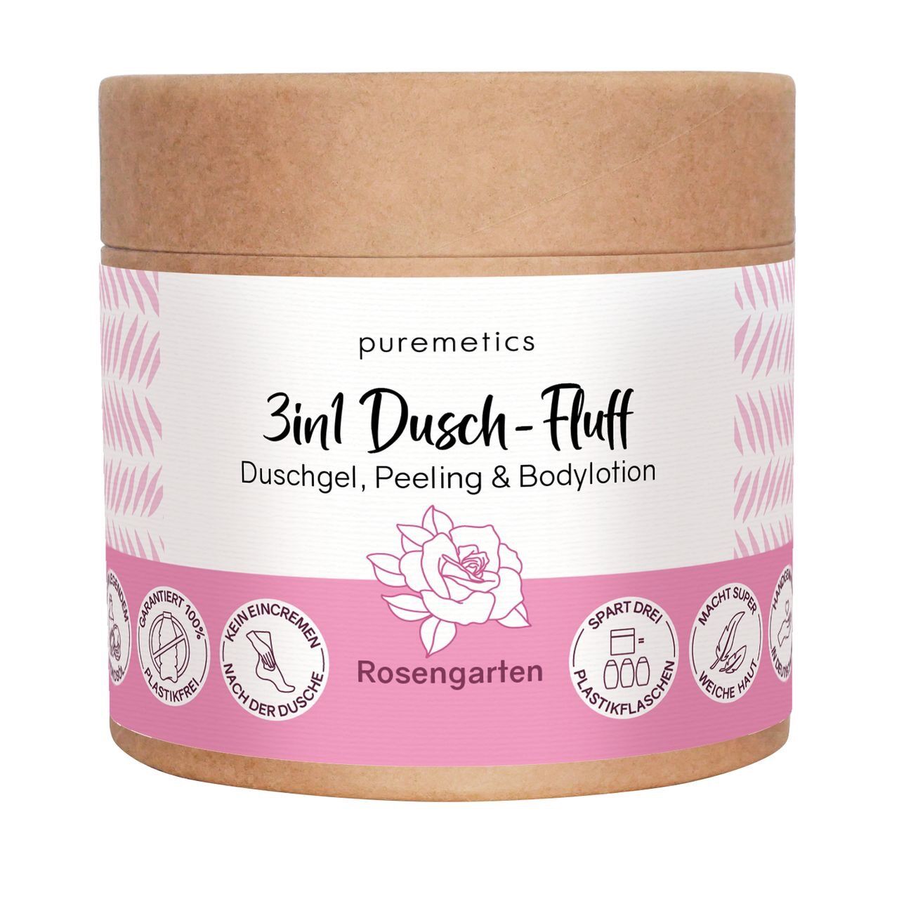 Duschgel, Peeling & Bodylotion in einem – 3in1-Dusch-Fluff pflegt, reinigt und glättet die Haut. Vegan, plastikfrei und klimaneutral.