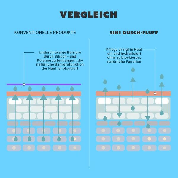 Erlebe die Pflege-Revolution für deine Haut: Das 3in1-Dusch-Fluff vereint Duschgel, Peeling und Bodylotion in einem mega angenehmen Produkt. Die samtige Textur schmilzt auf der Haut, reinigt gründlich und pflegt gleichzeitig – für seidig weiche Haut ganz ohne eincremen nach dem Duschen.