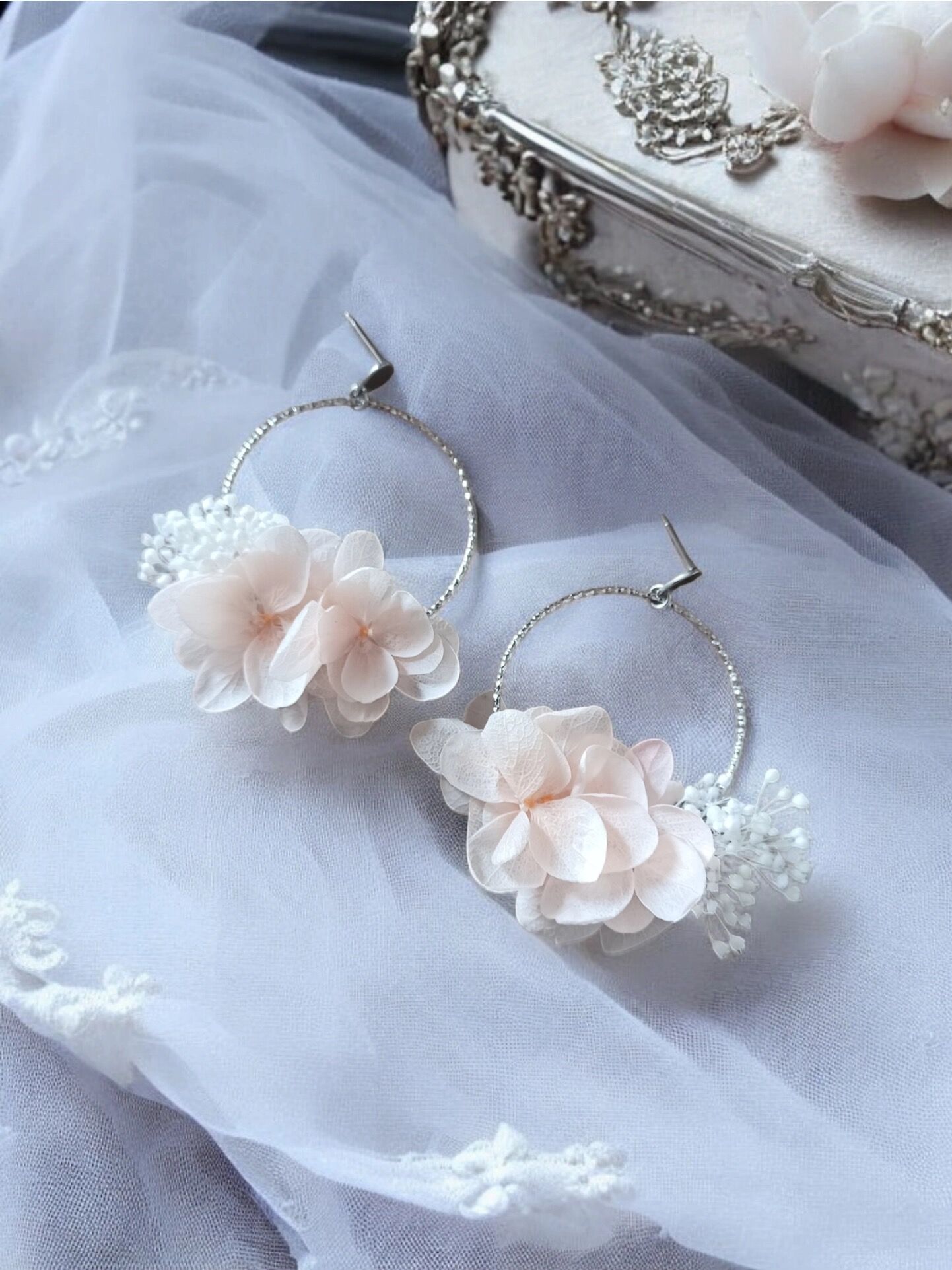 Silberne Creolen mit echten stabilisierten Blüten in Weiß & Rosa – perfekt für Braut & Brautjungfern.