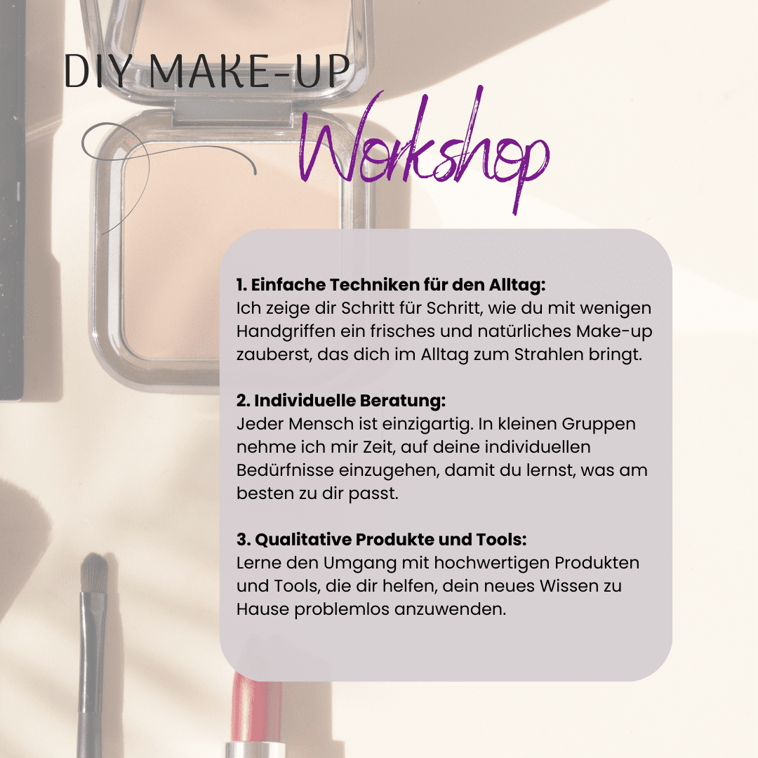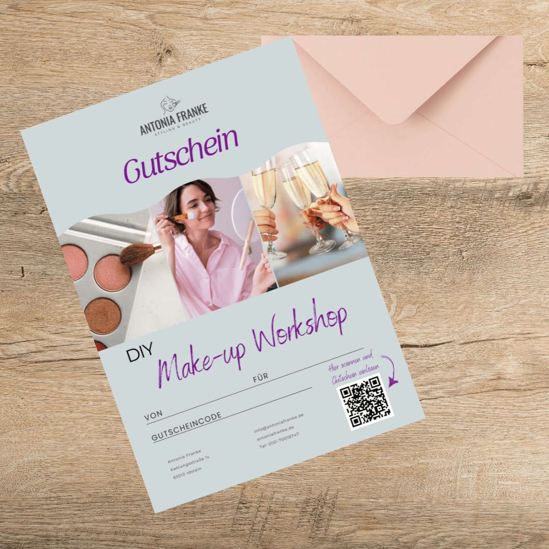 Verschenke ein individuelles Beautyerlebnis mit dem Gutschein für einen DIY Make-up Workshop! Hier lernen die Teilnehmerinnen, ihr Make-up passend zum eigenen Stil und Typ selbst zu gestalten – von einem natürlichen Look bis hin zu aufregenden Akzenten. Unter professioneller Anleitung erhalten sie wertvolle Tipps und Techniken, um Make-up-Produkte und Farben optimal aufeinander abzustimmen.
