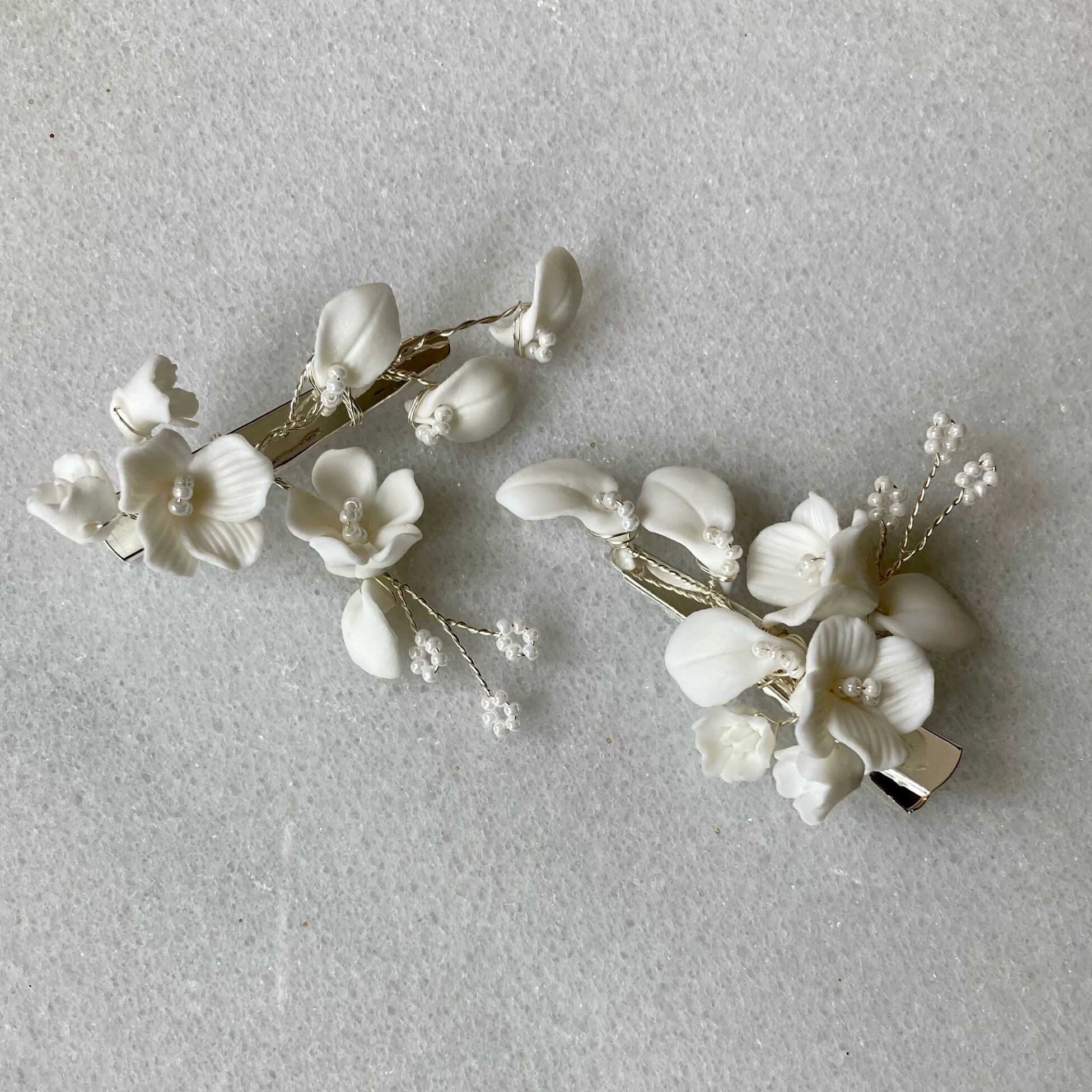 Zart verzierte Hairclips aus Keramikblüten & silberfarbenen Blättern – ideal für einen natürlichen Brautlook im Bohème-Stil.